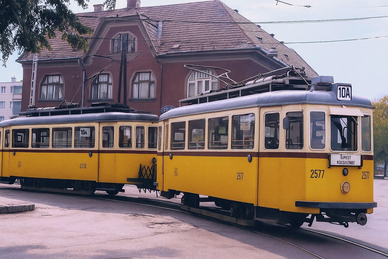 Kocsiszíni menetre áttáblázott 2576+2577 pályaszámú acélvázasított ikerkocsi Rákospalotán a Kossuth u. - Dózsa György út (ma Fő utca) sarkon a végállomási nagyhurokban, a 10A viszonylat utolsó évében - 1984-es, eredetileg fekete-fehér fotó  színezett, újraalkotott változata.
