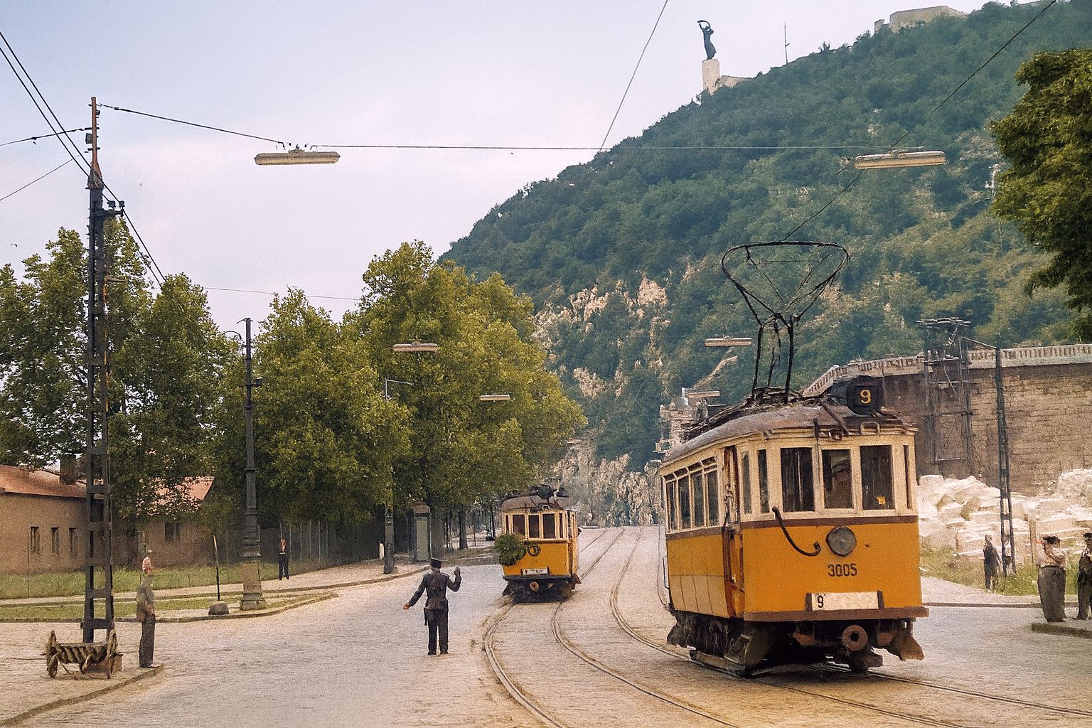 Favázas, nyitott peronos, kéttengelyes motorkocsik a Döbrentei téren a 9-es viszonylaton - 1959-es, eredetileg fekete-fehér fotó színezett, újraalkotott változata.