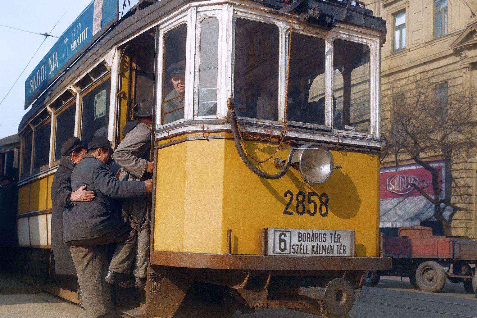 Favázas, nyitott peronos motorkocsi lépcsőn utazó emberekkel a Szent István körúton - a Visegrádi utca vonalában - a 6-os viszonylaton - 1950-es, eredetileg fekete-fehér fotó színezett, újraalkotott változata.